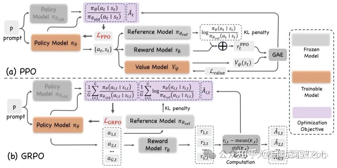 PPO是RLHF的默认优化算法,属于一阶信任域方法,核心是“限制策略更新幅度以保证稳定”(图3a):