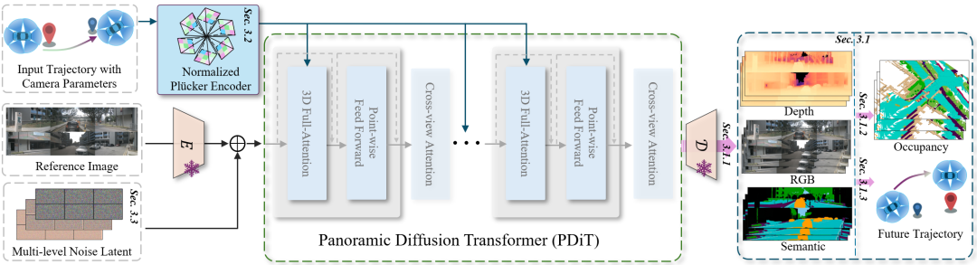 - 全景多模态生成 (State) :利用 Panoramic Diffusion Transformer (PDiT) 作为核心,联合生成像素级对齐的 RGB、语义、深度、3D Occupancy 四种模态的视频。