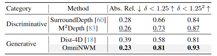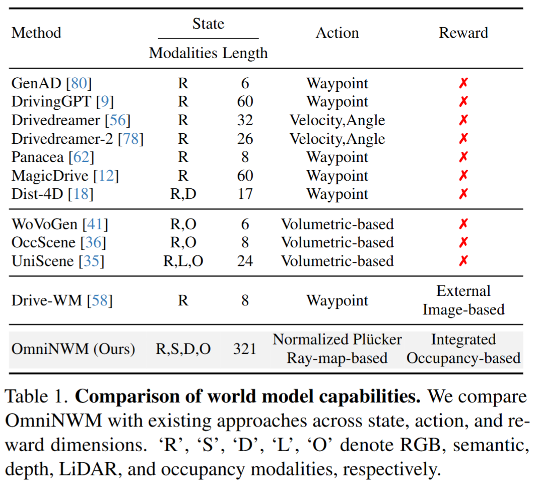 表1:OmniNWM 与现有世界模型在状态、动作、奖励三个维度的能力对比