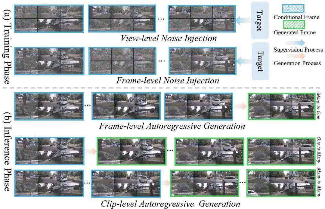 训练时对每帧 、每视角 的潜在表示 施加独立噪声: