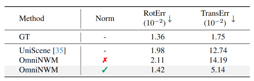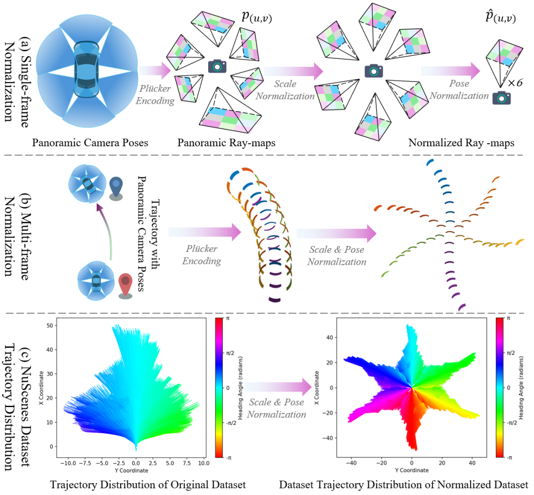 为支持跨数据集、多相机配置下的泛化能力,OmniNWM 对 Ray-map 进行 尺度归一化 与 位姿归一化: