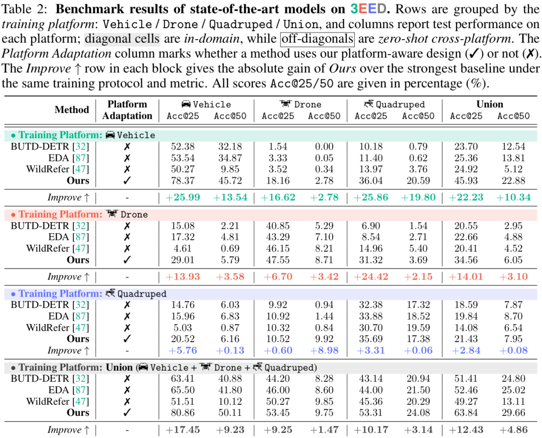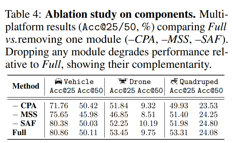 实验结果(如下表所示)揭示了一个严峻的现实:现有模型在跨平台泛化方面存在巨大鸿沟。例如,一个在汽车数据上训练得很好的模型(在汽车测试集上Acc@25达到53.54%),直接拿到无人机数据上测试时,性能会暴跌至 3.33%。这充分说明了跨平台3D定位的巨大挑战。