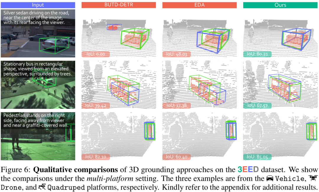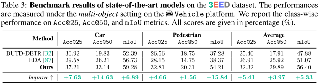 此外,3EED还支持更复杂的 多目标定位 任务,即一句话可能提到多个物体,模型需要将它们全部找出来。
