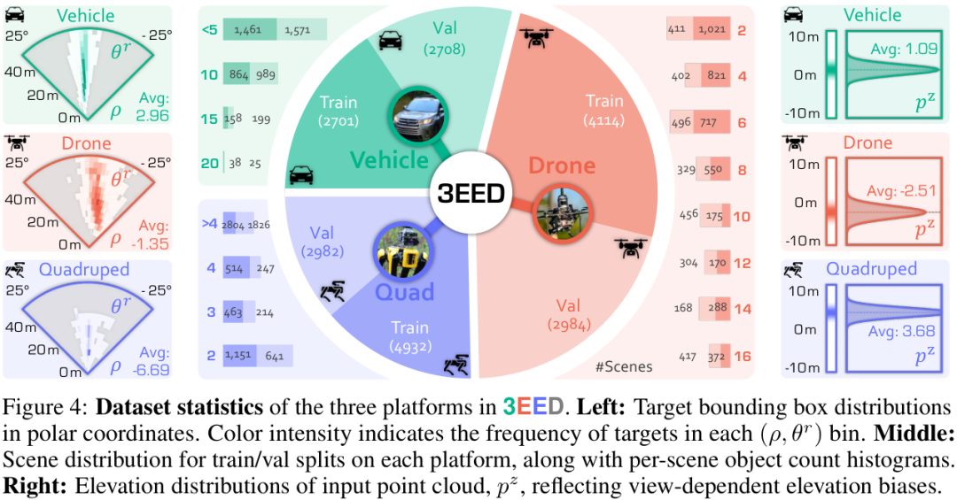 数据集的统计分析也进一步揭示了平台的差异性。例如,无人机采集的场景通常物体更密集,但点云更稀疏;而汽车采集的数据点云密度最高。这些差异为研究模型的鲁棒性和泛化能力提供了绝佳的试验场。