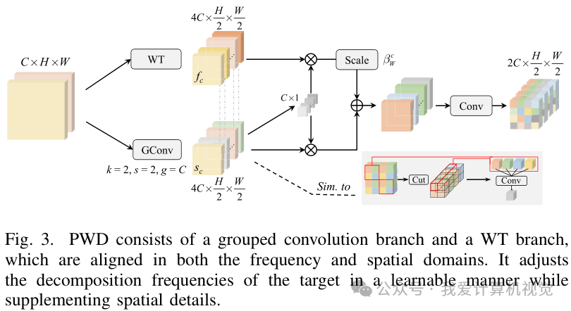 PWD模块非常巧妙,它包含两条分支:一条是固定的哈尔小波变换(Haar WT)分支,用于提供可解释的频域分解;另一条是分组卷积分支,模拟小波引导的局部对比度,并补充空间细节。两条分支的输出通过通道注意力进行自适应融合。这种设计使得网络能够在下采样过程中,以一种可学习的方式调整目标的分解频率,既保留了频域的判别性,又补充了空间细节,防止了特征的丢失。