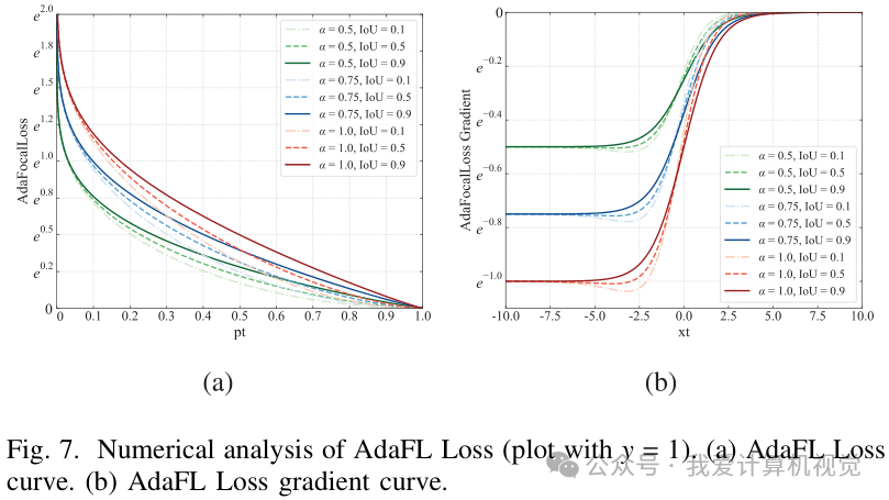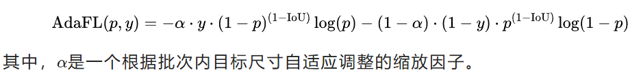 作者为此提出了自适应焦点损失(Adaptive Focal Loss, AdaFL)。该损失函数巧妙地将IoU引入Focal Loss的调制因子中,其形式如下