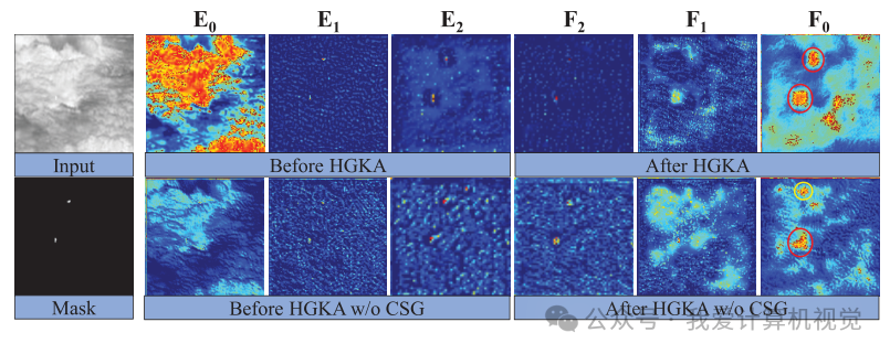 如上图所示,加入全局一致的空间注意力后(第一行),深层语义(E2)能够被有效传播到浅层特征(F0),使得网络在各个尺度上都能准确聚焦目标。