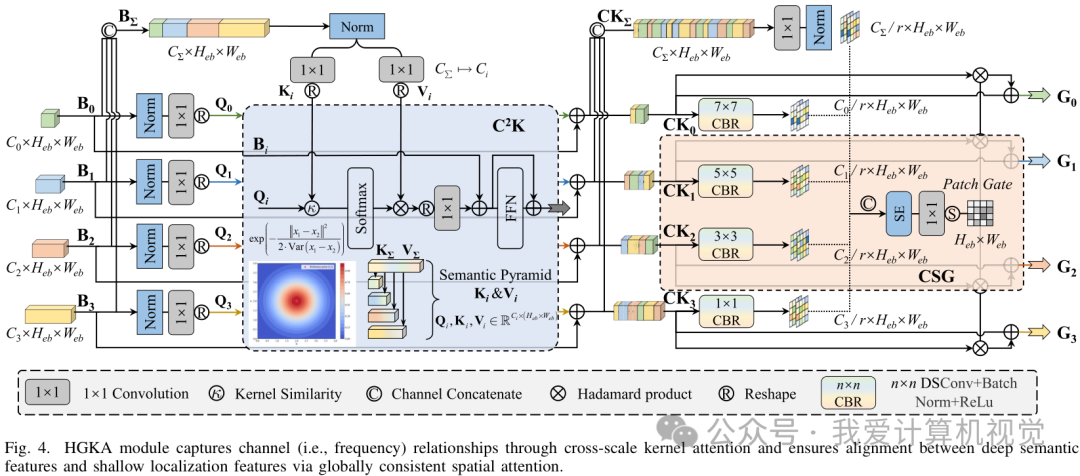 为了在网络的不同层级之间有效地融合频率和语义信息,作者提出了分层门控核注意力(Hierarchical Gated Kernel Attention, HGKA)模块。