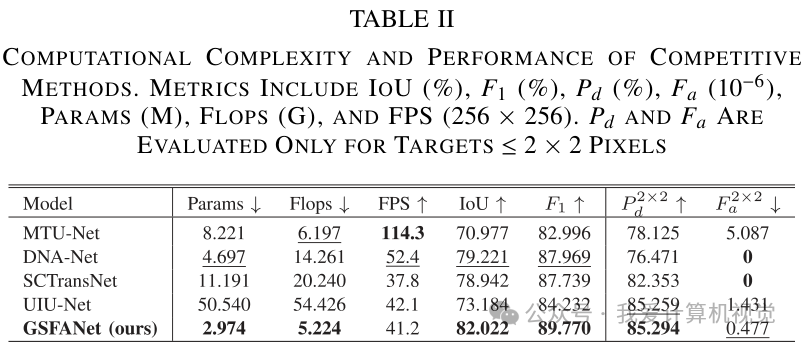 从上表的主要结果可以看出,GSFANet在各项关键指标上(IoU, F1, Pd, Fa)都取得了全面的领先,尤其是在SIRST和NUDT-SIRST数据集上,性能优势明显。这证明了其在区分目标与噪声以及精确提取目标形状方面的强大能力。