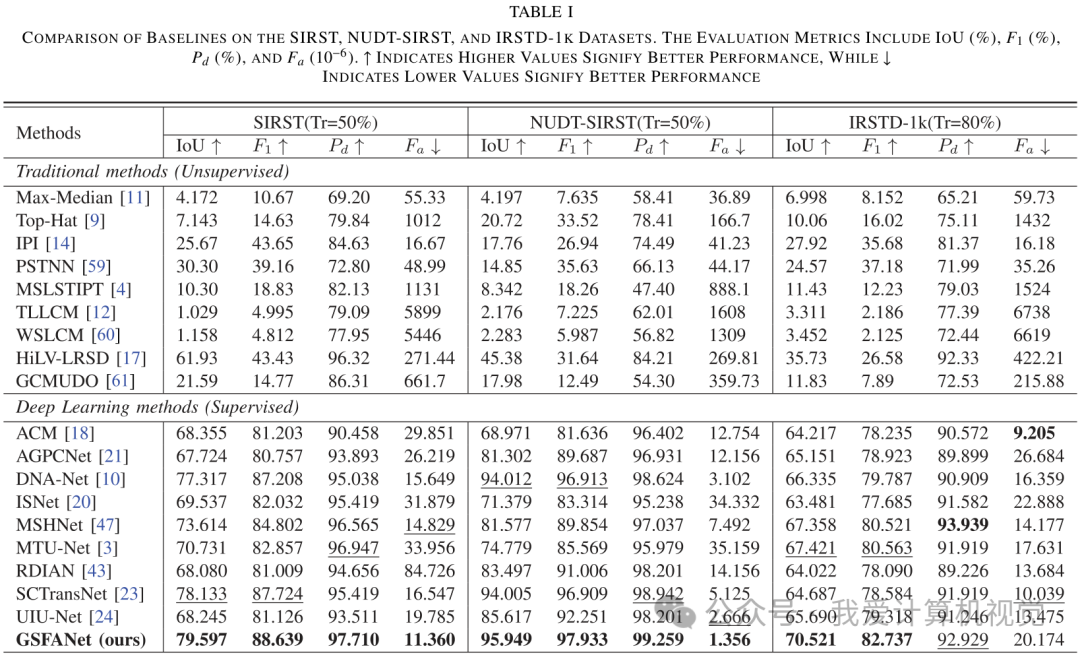 作者在SIRST、NUDT-SIRST和IRSTD-1k三个公开数据集上进行了详尽的实验,并将GSFANet与多种SOTA方法进行了比较。