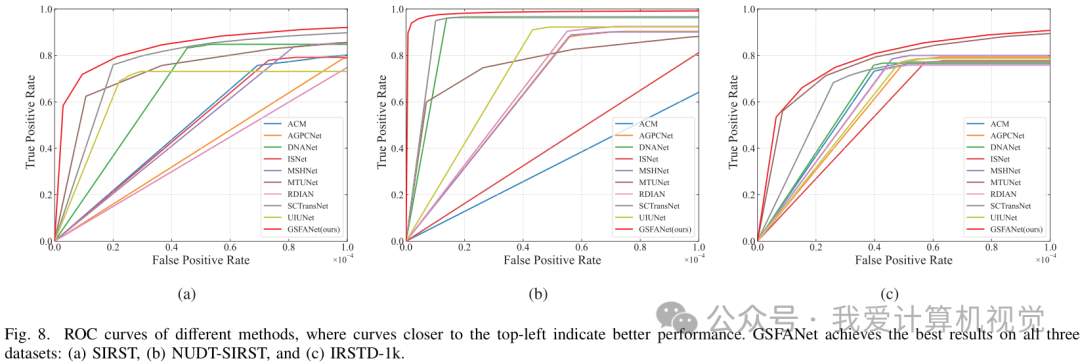 ROC曲线进一步证实了GSFANet的优越性,在三个数据集上,它的曲线都最接近左上角,表明在所有阈值下都具有最高的真阳性率和最低的假阳性率。