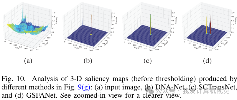 通过3D显著性图对比可以更直观地看到,GSFANet生成的响应热图(d)中,目标的峰值响应远高于噪声,背景抑制得非常干净,而其他方法(b, c)则容易将噪声误判为目标。