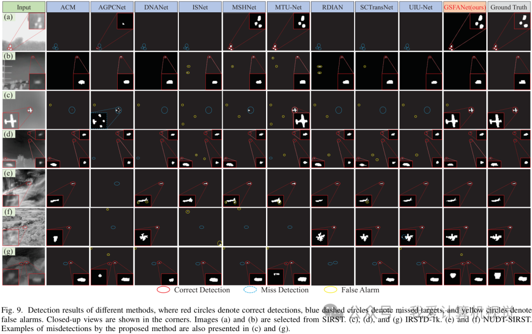 上图展示了在各种复杂场景下的检测结果。无论是面对密集目标(a)、强噪声干扰(b, d, g),还是需要精确分割轮廓的大目标(c, e, f),GSFANet都表现出了惊人的鲁棒性和准确性。许多其他方法会产生的漏检和虚警,GSFANet都能成功避免。