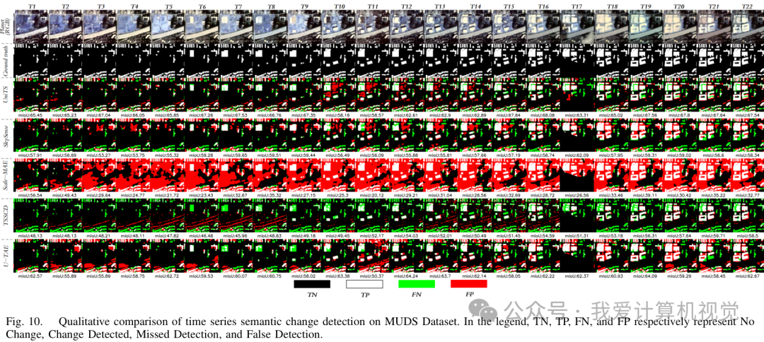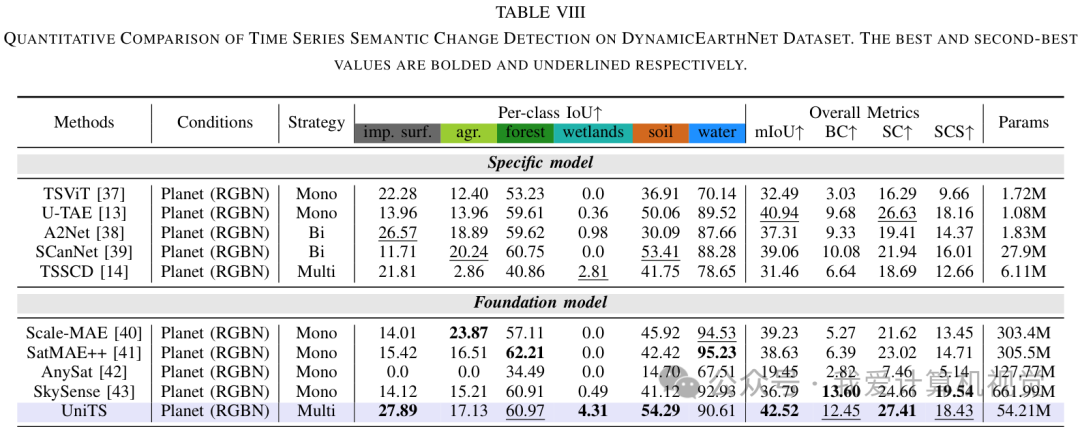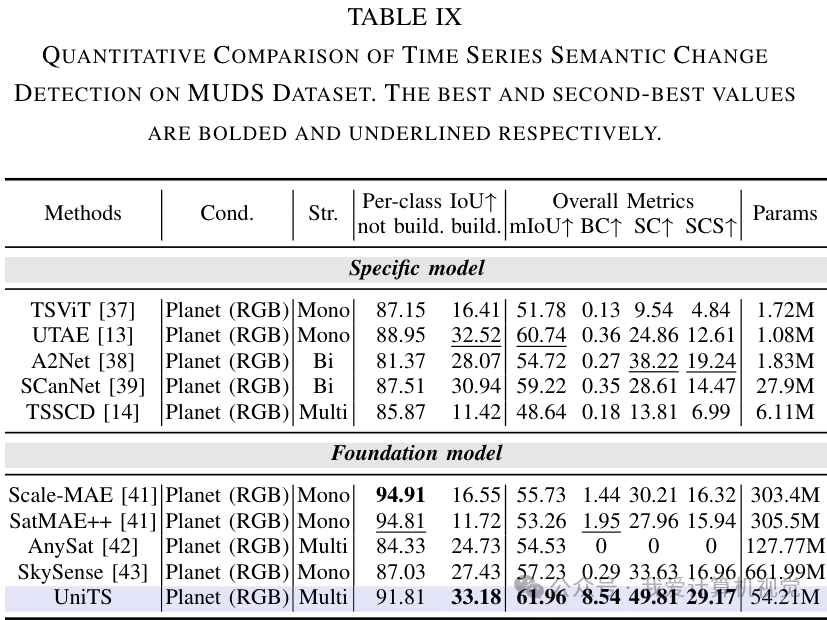 在这个高层语义任务上,UniTS 同样表现出色。它通过生成连续时间点的语义分割图,来分析地物类型的变化。在 DynamicEarthNet 和 MUDS 这两个主流数据集上,UniTS 的多项关键指标(如 mIoU、SCS)均超越了现有的专用变化检测模型和一些知名的遥感基础模型。
