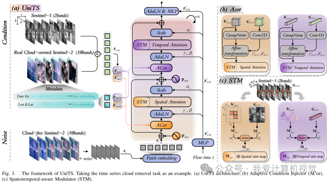 - **自适应条件注入器 (Adaptive Condition Injector, ACor)**在遥感任务中,我们常常需要利用多模态数据作为辅助信息,比如用不受云层影响的SAR(合成孔径雷达)影像来帮助恢复被遮挡的光学影像。ACor 的作用就是高效地将这些条件信息(如 SAR 影像、历史影像序列等)融入到生成过程中。它通过动态生成仿射变换参数(缩放和平移),对主干网络中的特征图进行调制。这种方式比传统的拼接或交叉注意力机制更灵活、更精细,能让模型更好地感知和利用条件信息,实现高质量的可控生成。