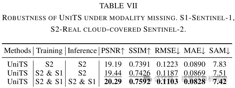 更有趣的是,实验证明 UniTS 具有很强的鲁棒性。即使在推理时缺少了 SAR 这一模态的输入,其性能仅出现轻微下降,依然远超那些仅使用单模态训练的模型。这表明 UniTS 在多模态训练中学会了灵活平衡不同信息源,而不是过度依赖某一特定模态。