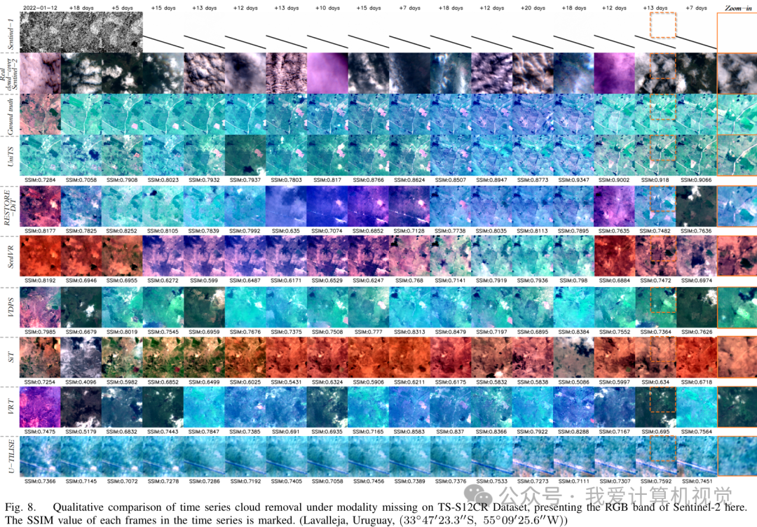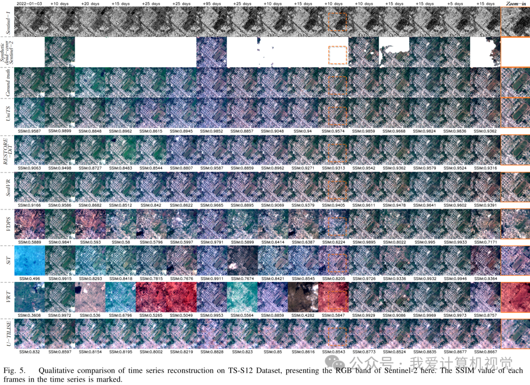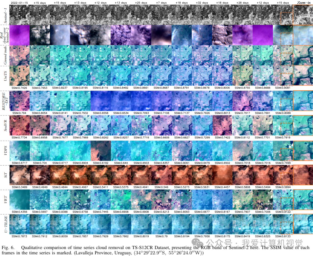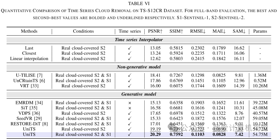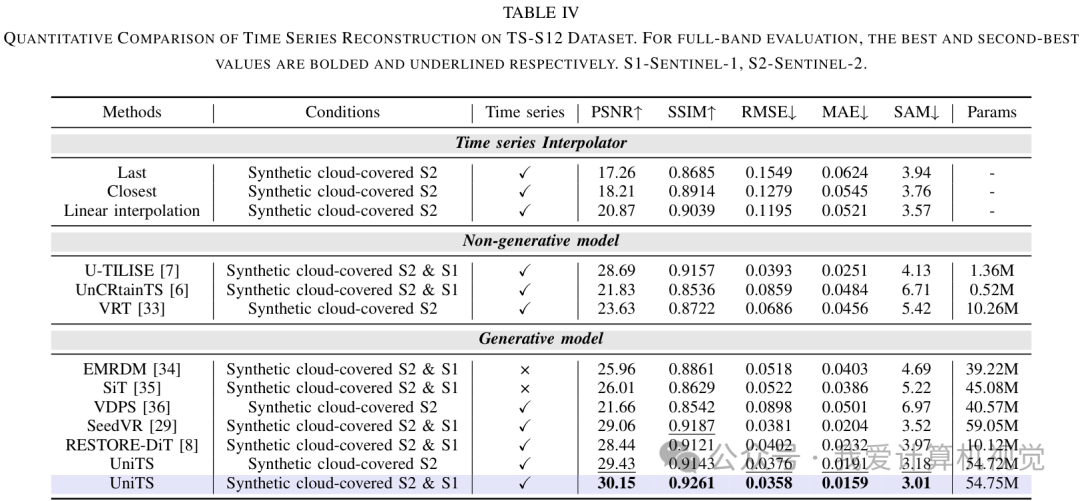 以下是时间序列去云在 TS-S12CR 数据集上的定量比较结果: