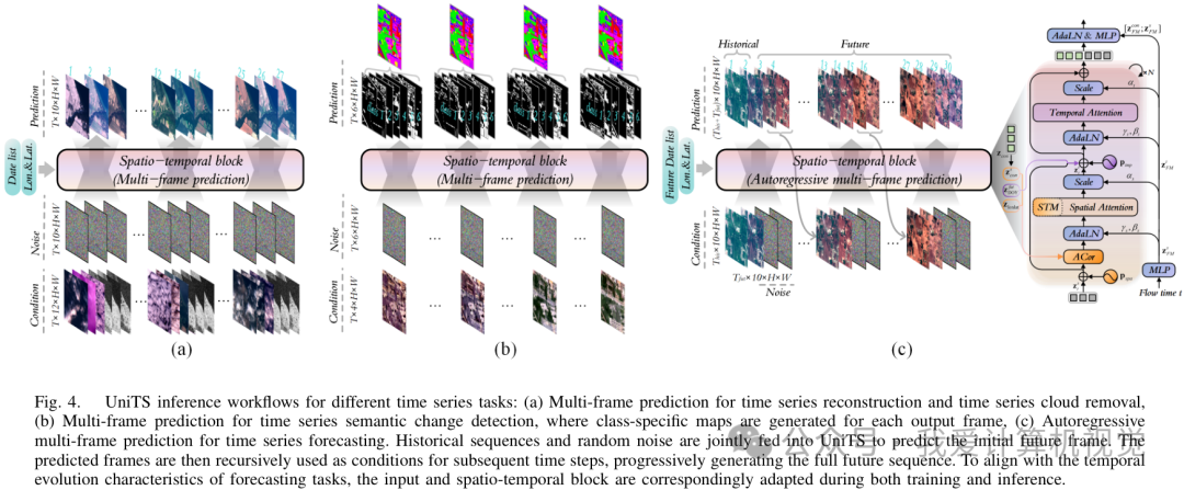 通过这套组合拳,UniTS 能够根据不同任务的输入(比如去云任务输入带云影像和SAR影像,预测任务输入历史影像序列),在统一的框架下,生成相应的目标输出(无云影像或未来影像序列)。