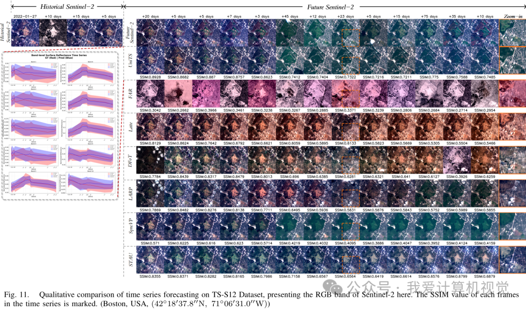 在预测未来遥感影像序列的任务上,UniTS 采用自回归的方式,将历史序列和噪声一同输入,逐步生成未来的影像帧。实验结果显示,UniTS 生成的未来影像不仅空间上清晰、细节丰富,而且能更准确地捕捉到气候和物候的动态演变规律。在 TS-S12 数据集上,其 PSNR 比次优的 SyncVP 模型高出 1.52 dB。