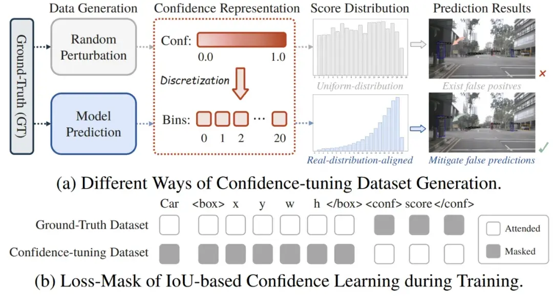 IoU-aware 置信度预测则显式建模候选框的定位质量。在训练阶段监督置信度微调数据集(Confidence-tuning Dataset)的分值 token,在推理阶段输出预测框与真实框的 IoU 预测结果,并将该 IoU 置信度分数与分类分数联合用于整体置信度排序。相比仅依赖分类得分的传统方案,这一设计在小目标、远距离目标以及长尾类别上能够提供更一致的候选排序,减少 NMS 阶段的误删与误保留,从而整体提升密集检测的可靠性。