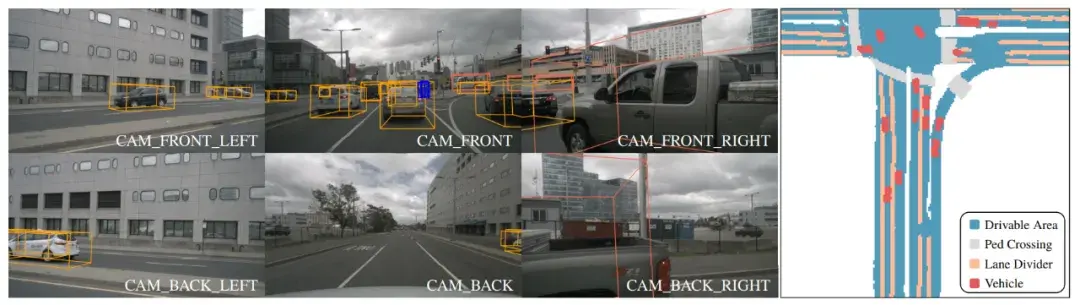 图 6: BEV 感知上 Percept-WAM 的 3D 检测及 Map Segmentation 结果