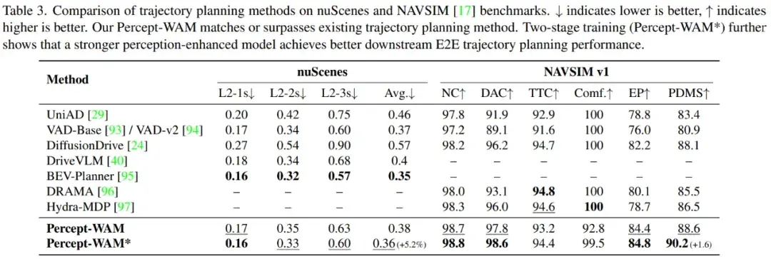 表 3: 轨迹预测场景下 Percept-WAM 的效果与其他主流模型的对比