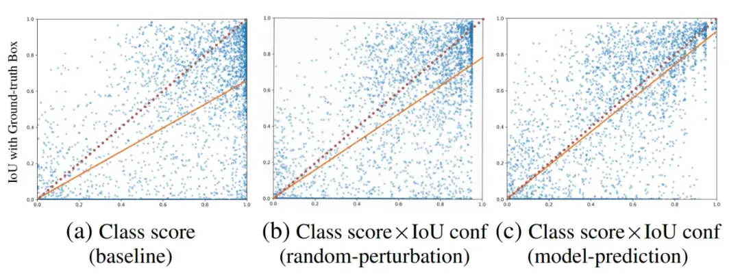 该文章同时可视化了预测的置信度分数(x 轴)与对应框真实 IoU(y 轴)之间的关系。如下图所示,引入 IoU-based confidence prediction 后,散点分布整体向 y = x 附近收敛,而在基于 model-prediction 数据集进行训练的设置下,曲线与对角线的贴合度最高,说明预测分数与真实定位质量更加一致,更适合作为后续筛选与排序的依据。