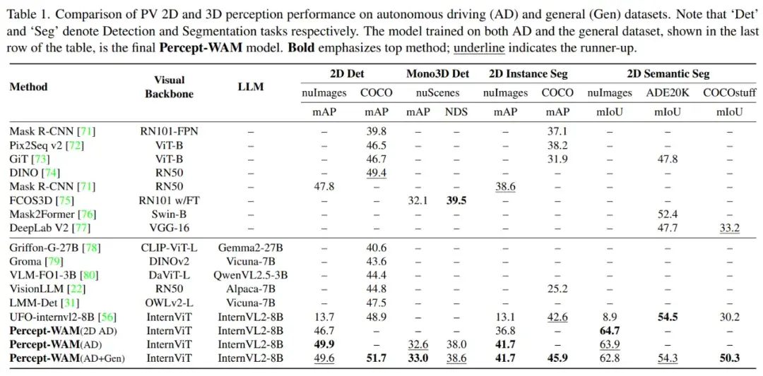 表 1: PV 场景下 Percept-WAM 的效果与其他主流模型的对比