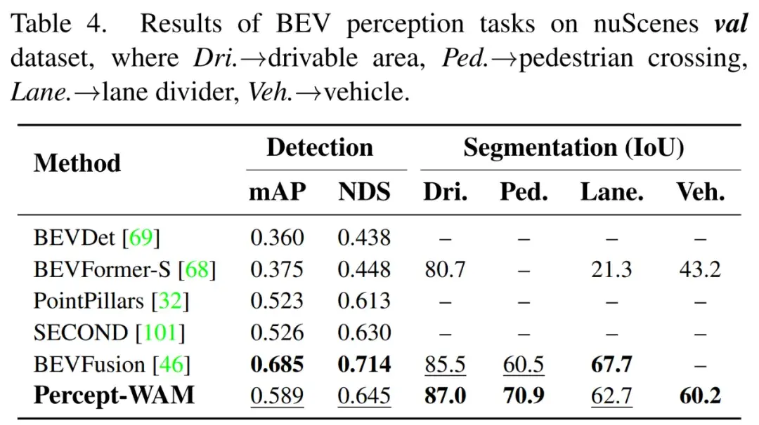 表 2: BEV 场景下 Percept-WAM 的效果与其他主流模型的对比