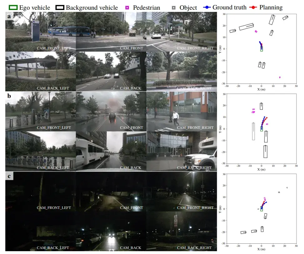 在定量结果之外,我们还给出三类代表性可视化示例:(i)PV 视角下的 2D 检测 / 实例分割与 mono 3D 检测结果,(ii)BEV 视角下的 3D 检测与 map 分割,(iii)NAVSIM /nuScenes 场景中的端到端规划轨迹。