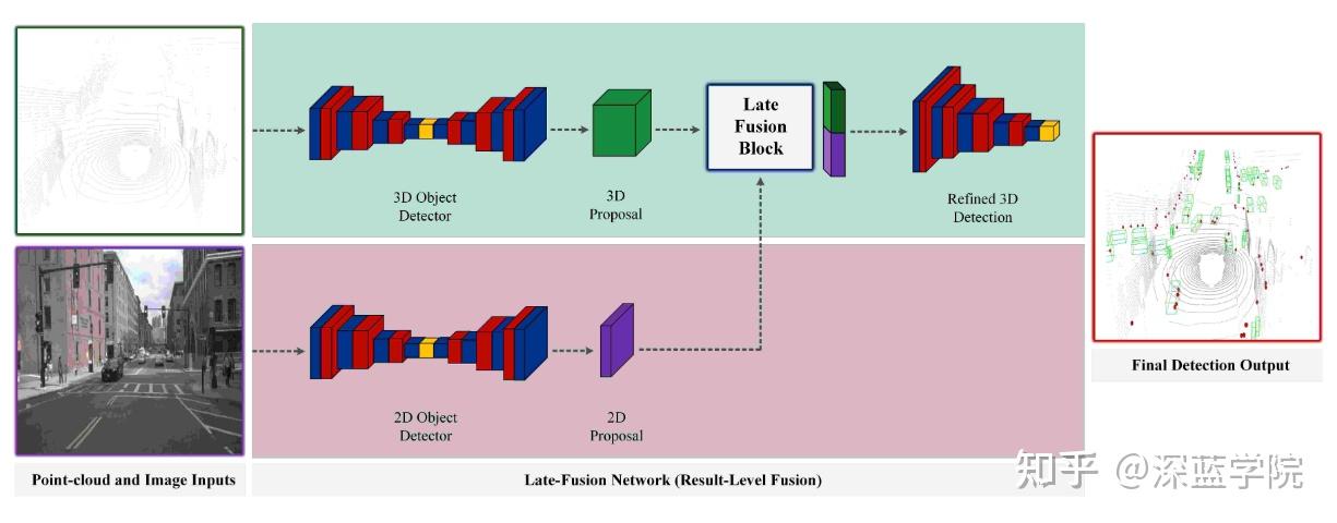 ● 决策级融合则更接近“系统安全冗余”的理念。其方法是在各自完成检测后再在决策层进行合并,例如选择置信度更高的框、或者利用交叉 NMS 进行最终筛选。这类方法牺牲了跨模态低层特征交互的学习能力,但却在安全性和稳定性上表现更好,因此常用于自动紧急制动(AEB)、前向碰撞预警等安全关键模块。