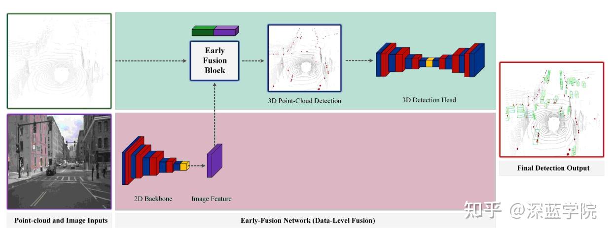 ● 数据级融合通常被称为 Early Fusion,即在输入层面就将 LiDAR 与摄像头数据进行对齐与拼接,例如将 LiDAR 投影到图像平面,或生成密集深度图后直接作为网络输入。这样的方式保留了最丰富的底层信息,但也对标定精度提出了更苛刻的要求,同时输入维度大、计算成本高,使其更适合算力充足、精度优先的系统。