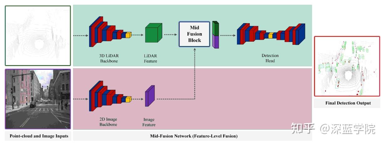 ● 特征级融合是工业界使用最广泛的方法,也是当前自动驾驶感知系统的主流方案。在这一策略中,Camera 与 LiDAR 各自经过 backbone 提取特征,再通过拼接、加权、注意力机制等方式融合成统一表示。这样的结构兼容性强,可以灵活组合不同的视觉或点云网络,同时对传感器之间的小幅错位更具鲁棒性。