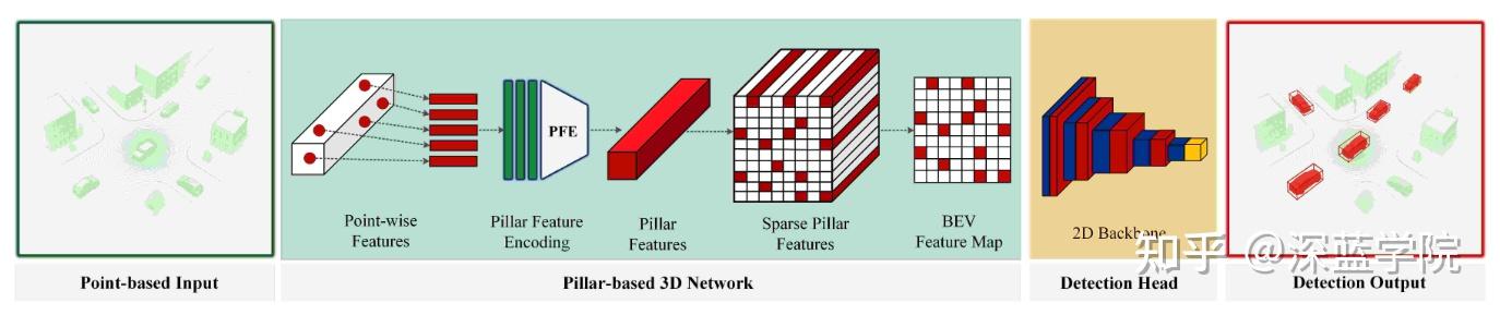 每个 pillar 内的点通过轻量化 PointNet 编码,再被映射成 BEV 平面上的 pseudo-image 特征,后续即可使用标准的 2D CNN 完成检测。