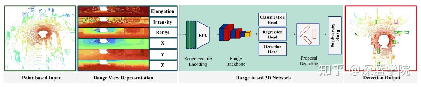 除了点和体素,还有一种思路是将 LiDAR 点云投影到“深度图”形式加以处理。Range View 方法的流程为:将点云映射到以方位角、俯仰角和距离为坐标的二维网格,使其变成规则的图像,再用成熟的 2D CNN 网络提取特征。