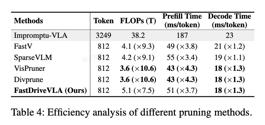 实验结果显示,在不同剪枝比例下,FastDriveVLA 在 nuScenes 开环规划基准测试中均取得了 SOTA 性能。FastDriveVLA 也非常高效,当视觉 token 数量从 3249 减少至 812 时,FastDriveVLA 的 FLOPs 直降约 7.5 倍;在 CUDA 推理延迟方面,FastDriveVLA 将预填充(prefill)时间减少了 3.7 倍、将解码(decode)时间减少了 1.3 倍,显著提升了推理效率。