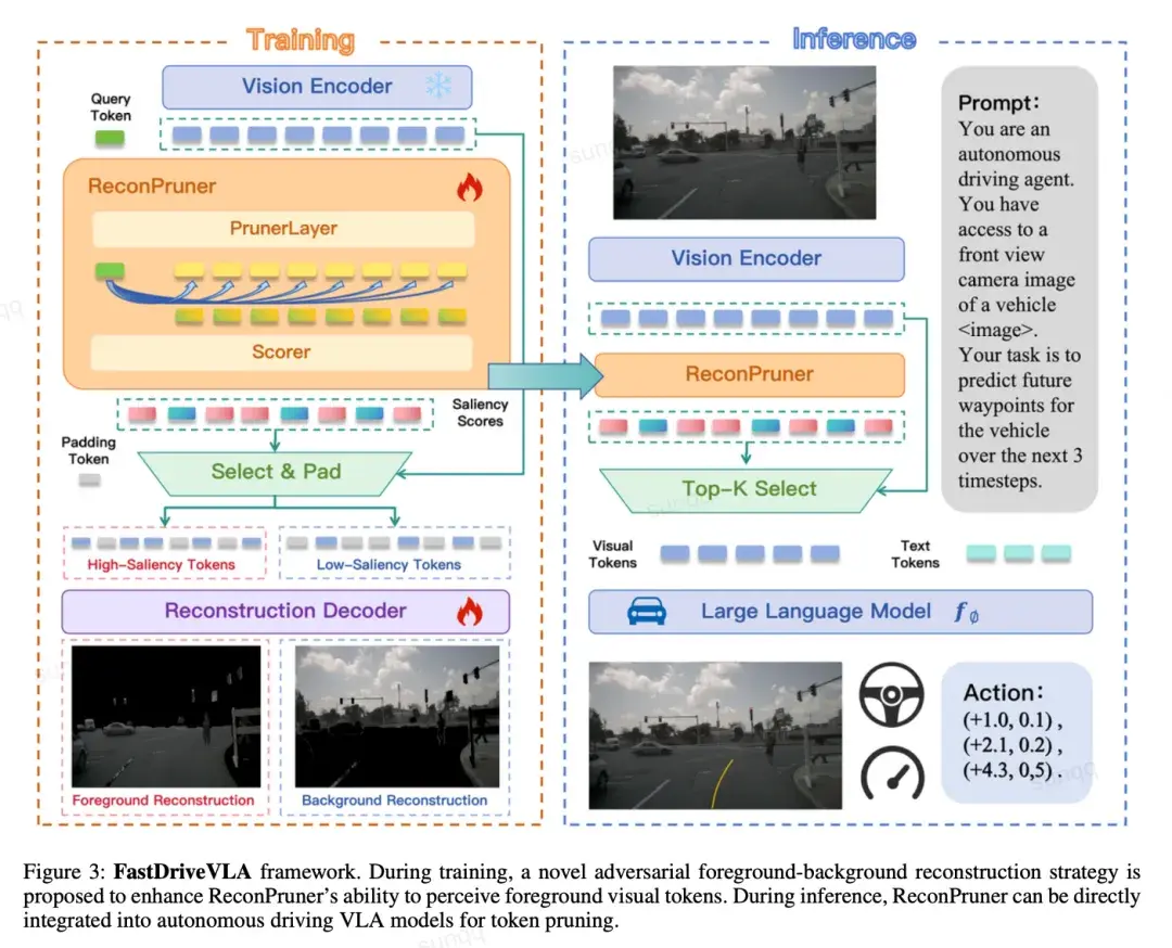 图 3:FastDriveVLA 框架。在训练阶段,提出了一种新颖的「前景 – 背景对抗重建」策略,以增强 ReconPruner 对前景视觉 token 的感知能力;在推理阶段,ReconPruner 可直接嵌入自动驾驶 VLA 模型,用于 token 剪枝。