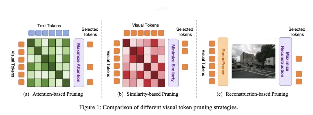 图 1:不同视觉 token 剪枝策略的对比,(c)为基于重建的剪枝策略