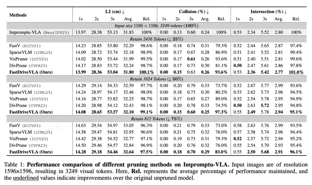 - 当剪枝 25% 时,FastDriveVLA 在所有评估指标上均表现最佳,尤其在 L2 轨迹误差和碰撞指标上分别比未剪枝的原始模型低了 0.1% 和 1.0%,这证明了聚焦于与前景相关的视觉 token 是提升自动驾驶性能的关键。