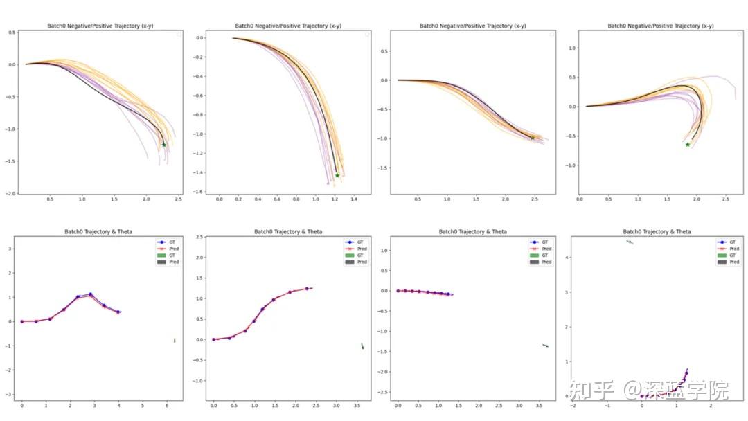 ▲图6|真实环境结果可视化。上排:规划轨迹黑色轨迹是真值(ground truth),黄色和紫色是预测轨迹,绿色星标是目标点。用这排图主要看:预测轨迹是否能贴近真值趋势,能否顺利指向目标。下排:定位结果。蓝点是真值定位,红点是预测定位;绿色箭头是真值目标方向,灰色箭头是预测目标方向。用这排图主要看:策略内部学到的“空间位置感”是否能跟上真实运动,并把目标方向估计得足够稳定