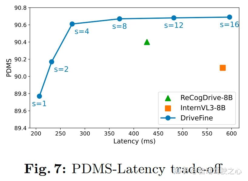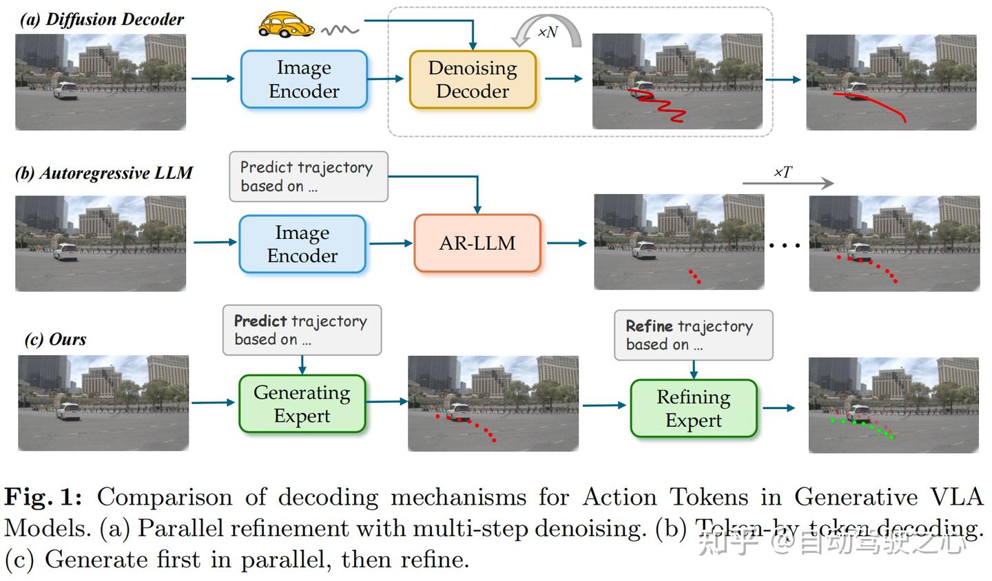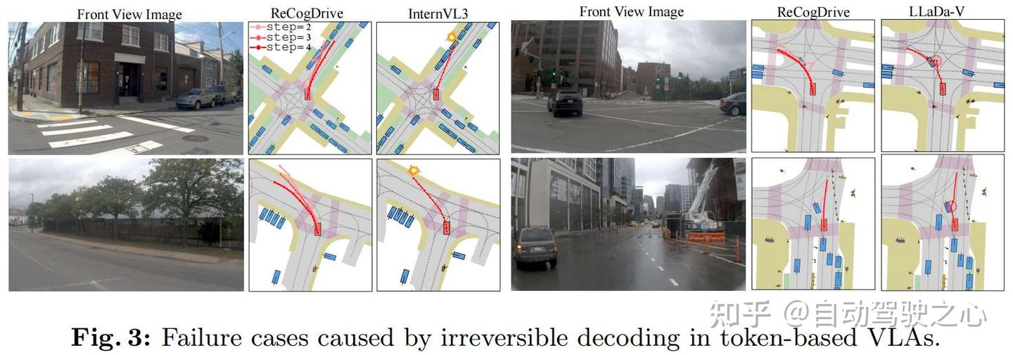 (2)基于token的VLA模型:将动作自回归解码为预定义词汇表中的token,实现了视觉、语言和动作的统一表征。实验表明,对InternVL模型进行面向PDMS的强化微调时,其PDMS和EPDMS指标会同步提升,体现出更强的泛化能力和可扩展性。但这类模型在性能和效率上整体落后于基于扩散模型的同类模型,主要原因是其采用的因果注意力机制和固定的逐token解码方式计算成本高昂,且推理过程中易产生误差累积。更关键的是,这类模型继承了大语言模型的不可逆解码特性:token一旦解码完成便无法修改。而驾驶规划对噪声高度敏感,哪怕是点位级的偏差,也可能导致整个轨迹规划失败,例如引发碰撞或车辆驶离道路。