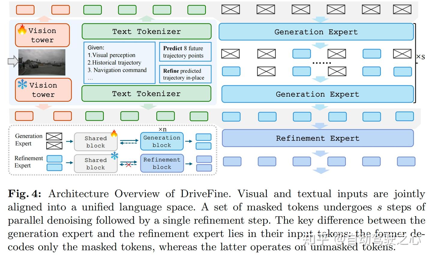 显然,两种VLA规划器的优劣势高度互补,这也促使我们探索一种能融合二者优势的模型。本文提出DriveFine,首次将显式的精修能力融入基于token的VLA模型,以实现更精准、更鲁棒的自动驾驶规划。我们采用预训练的多模态掩码扩散大语言模型(以LLaDA为大语言模型基础的LaViDa)作为基础规划器,相较于自回归大语言模型,该模型具备多项优势:并行解码提升效率、双向注意力实现更丰富的上下文建模、灵活的解码策略支持自适应学习。