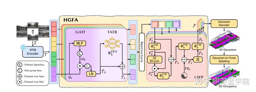 VG3S的整体流程清晰而优雅:冻结的VFM编码器处理多视角图像,输出一组携带几何先验的视觉token;HGFA适配器将这些token逐步转化为几何增强特征;高斯解码器据此生成3D高斯基元;最后通过高斯到体素溅射得到密集的3D语义占用预测。