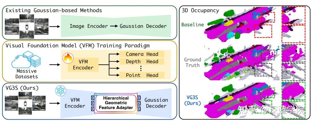 他们提出了VG3S(Visual Geometry Grounded Gaussian Splatting),在nuScenes基准上实现了IoU提升12.6%、mIoU提升7.5%的显著突破。