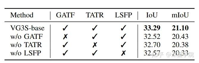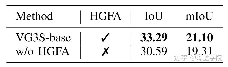 消融实验进一步验证了HGFA三个模块缺一不可:去掉GATF,IoU从33.29%降至32.52%;去掉TATR,降至32.70%;去掉LSFP,降至32.57%。