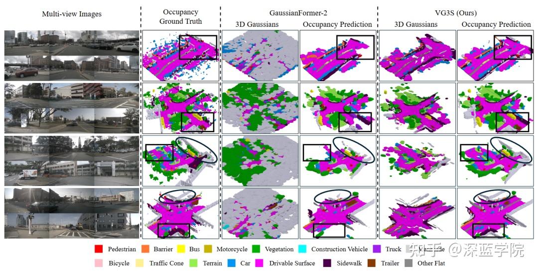 图4 | 四个真实驾驶场景的定性对比:基线 vs VG3S。每行对应一个场景,从左到右依次是多视角输入图像、占用真值、GaussianFormer-2的3D高斯分布与占用预测、VG3S的3D高斯分布与占用预测。方框和椭圆标注了关键差异区域——基线在路面连续性、建筑物轮廓和停车场结构上均存在明显缺失,而VG3S在几何先验的加持下,这些区域的预测更加完整、连贯。